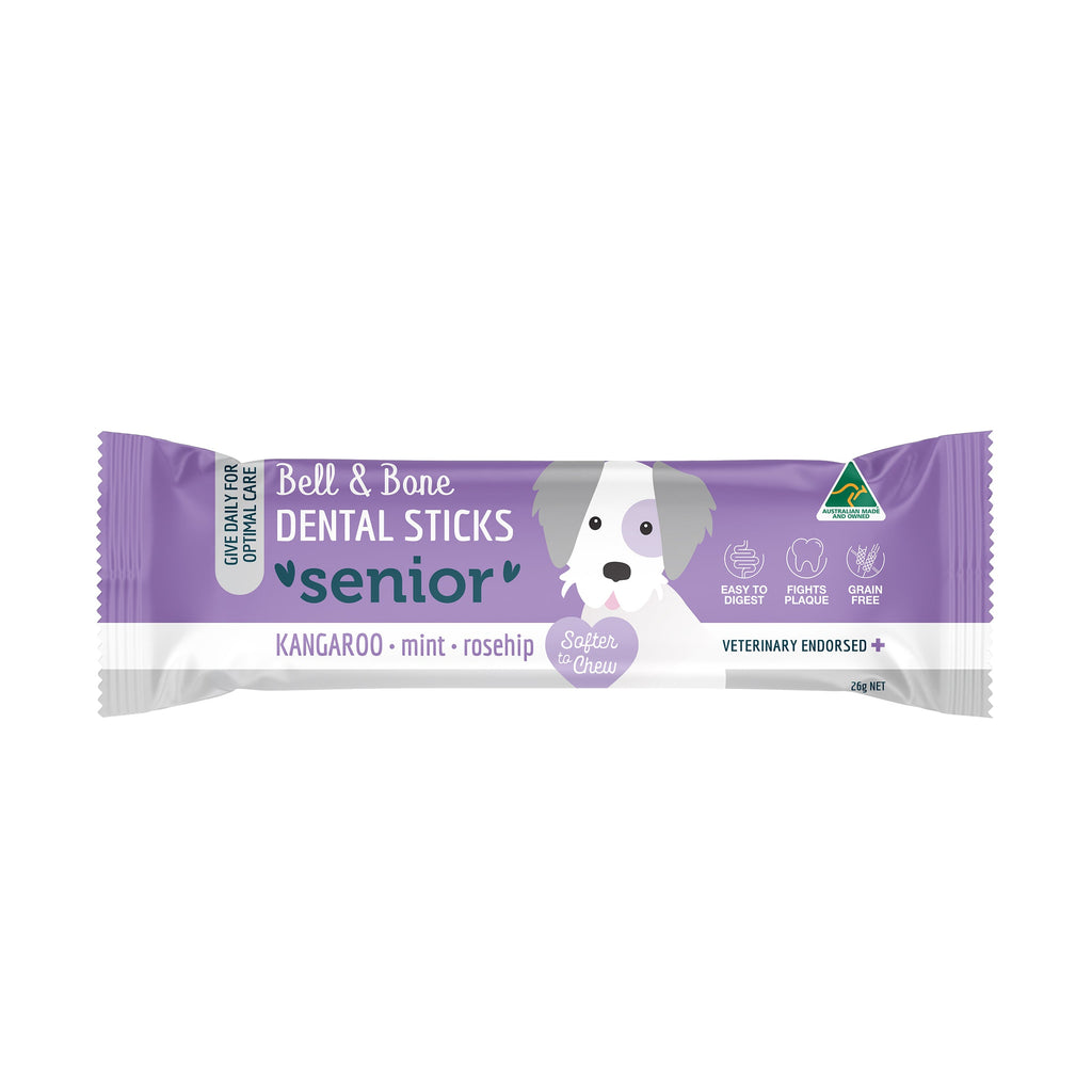 Bell & Bone’s Senior Kangaroo, Mint and Rosehip Dental Sticks have been developed specifically to support your senior dog’s oral health and overall well-being as they journey through their mature years. Reducing plaque and tartar build-up with their unique 3-pronged shape, these dental sticks are a softer chew tailored for senior dogs, encouraging gentle chewing and abrasion, and with the support of two active ingredients.
