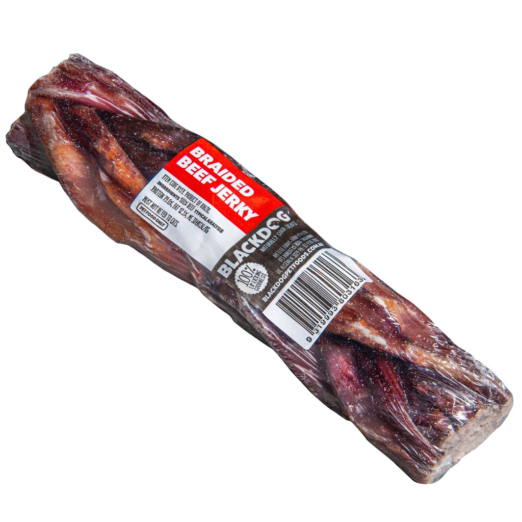 Beef jerky is dried premium muscle meat braided together for better teeth cleaning and dental hygiene. A single ingredient product made from 100% all natural beef.