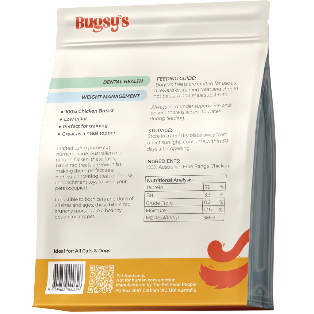 Bugsy's 100% Australian Chicken Bites are a crunchy, chewy and healthy treat your pet will absolutely love! Fill the nostrils with the smell of freshly baked chicken to get them to do new tricks!