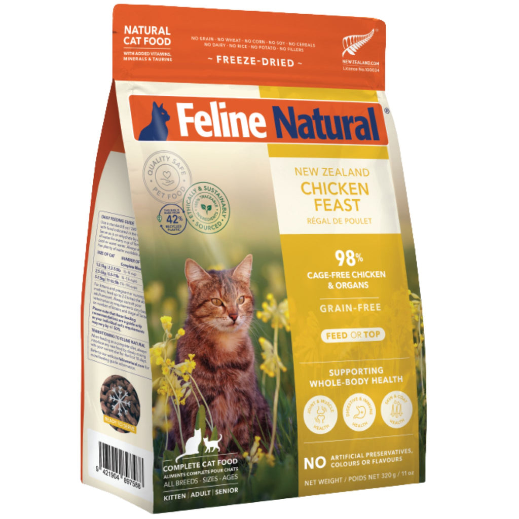 Our complete and balanced Freeze-Dried New Zealand Chicken Feast contains 98% Cage-Free Chicken and Organs with New Zealand Green Mussels, Kelp, Taurine, Flaxseed Flakes, Oil, Vitamins, and Minerals in support of your cat's whole-body health.