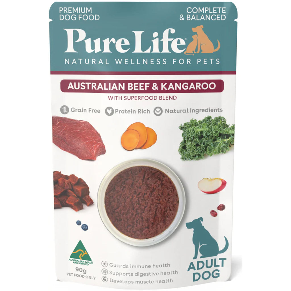 Pure Life Beef & Kangaroo Adult Dog Pouch is a premium, natural dog food made with a superfood blend. This highly nutritious food is made with a blend of high quality protein, amino acids, nutrients and minerals which support your dogs wellbeing and guards immune health.